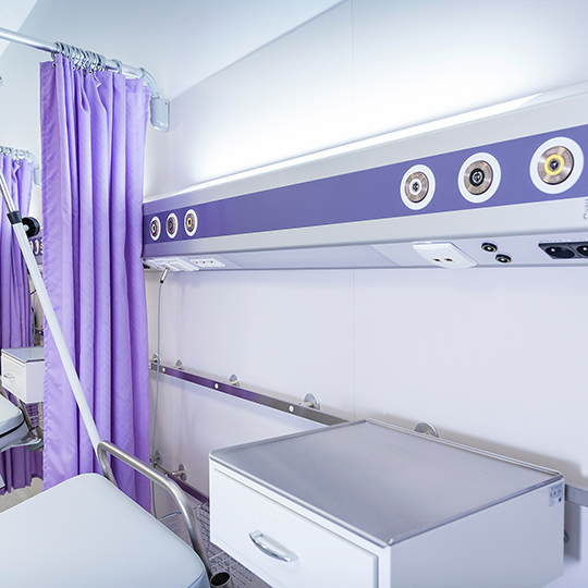 Zintegrowane punkty poboru gazów medycznych, gniazda elektryczne i teletechniczne (m.in. USB, HDMI, RJ-45), oświetlenie miejscowe i nocne oraz otworowanie pod system przyzywowy – wszystko w ergonomicznej formie dopasowanej do potrzeb użytkowników.